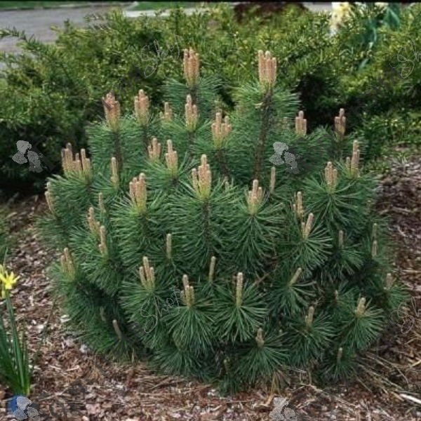 Сосна горная Пумилио (Pinus mugo Pumilio) – это компактный карликовый кустарник с густой распростертой кроной. Хвоя зеленая, жесткая короткая (3-5см). Максимальная высота – 1,5 м, диаметр - 3 м. В 30 лет 1 м высотой и до 2 м в диаметре.Направленные вверх побеги создают плотный купол над распростертыми стелющимися ветвями. Сосна горная Пумилио солнцелюбива, морозо- и засухоустойчива, хорошо растет как на щелочных, так и на кислых почвах. Не любит уплотнения грунта и застойного переувлажнения. Морозостойка.