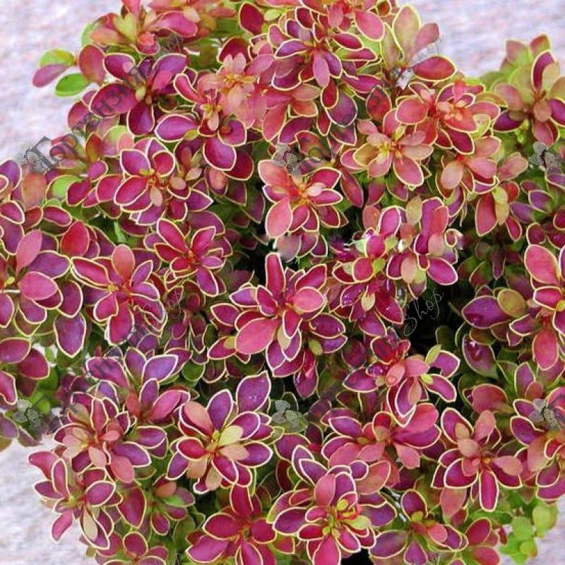 Барбарис 'Тунберга Голден Ринг', Berberis thunbergii «Golden Ring» - раскидистый колючий лиственный кустарник, с округлой, плотной кроной. Высота взрослого растения - до 2,5 м, диаметр кроны до 3 м. На побегах имеются шипы. Годовой прирост составляет 10 см в высоту и 15 см в ширину. Листья овальные, летом по цвету бордовые с жёлтой каймой, осенью - окрашиваются в насыщенно-красные тона. Светолюбив, Теневынослив. Засухоустойчив. Морозостоек.