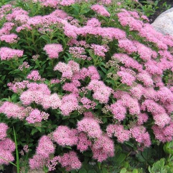 Спирея японская 'Нанa' Spiraea japonica 'Nana'- компактный медленнорастущий  кустарник высотой до 0,5 м с округлой кроной диаметром до 0,8 м. Листья зелёные, при распускании с красноватым оттенком. Цветки сиренево-розовые.Вынослива, неприхотлива. К почвам мало требовательна, но лучше растет на плодородных, влажных, хорошо дренированных почвах. Светолюбива, но выносит небольшое затенение.Зимостойкость высокая. Формирующую обрезку достаточно провести только ранней весной.