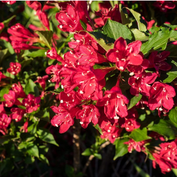 .Вейгела цветущая Люцифер (Weigela florida "Lucifer") - вертикальнорастущий кустарник, побеги слегка свисающие, медленнорастущий. Высота 1,5 м, ширина 1,5 м.Листья ярко-зеленые, эллиптические.Цветки трубчато-воронковидные, бутоны темно-красные, цветки кроваво-красные; цветет в июне. Цветки крупные 3 - 4 см. Цветет в июне, и если провести обрезку побегов, то в конце лета и осенью даст вторую волну цветения.