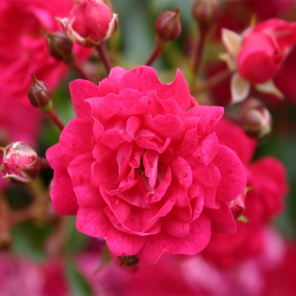Садовая роза Fairy Queen   Фейри Квин - Королева Фей   - сорт полиантовой розы, открыт R.A. Vurens (Нидерланды.). Куст густой, высотой 50- 80 см, шириной 35 см, обильно цветущий множеством густо махровых округло чашевидной формы цветков темно розового, средне красного цвета, собранных в большие кластеры. Аромат мягкий, яблочный. Листва глянцевая, светло зеленая.  Цветение волнами в течение всего сезона.