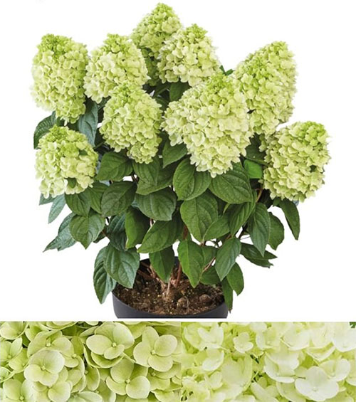 Метельчатая гортензия "Панорама" – эксклюзивная серия Патио немецкой селекции PAN, отличается невысокой, компактной формой куста, высотой до 100 см, рано зацветает и обильно цветет, неприхотлив в уходе. Соцветия плотные, конусовидные, в начале цветения нежно-зелёного цвета, затем белые, к осени приобретают лаймовый оттенок. На солнечном участке или в легкой полутени цветение будет пышнее и ярче. Ветви крепкие, прямостоячие. Цветет с июня по сентябрь. Почва кислая, влажная, но без застоя воды. Зимостоек, неприхотлив. Прекрасно смотрится как бордюрное растение, так можно выращивать и в кашпо.